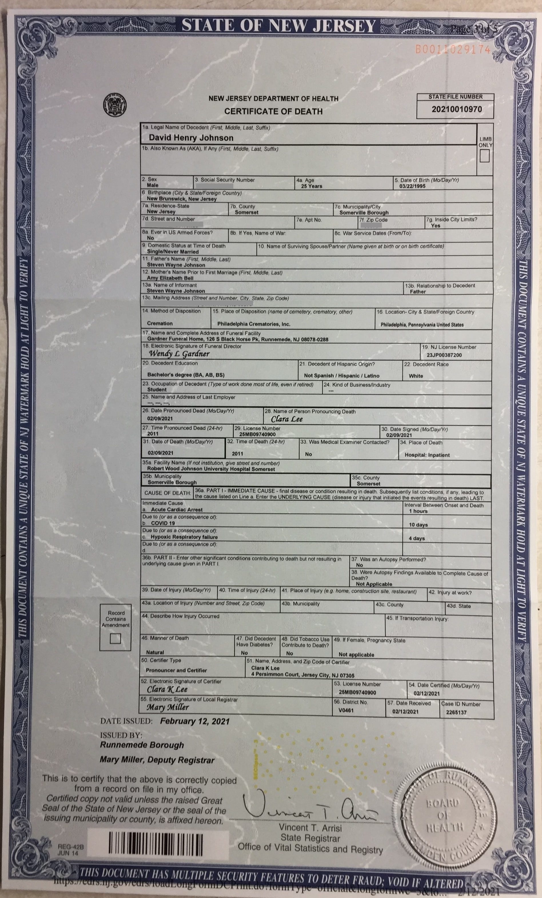 By Spring of 2020, when the pandemic began, David had graduated from Rutgers with his B.A. in History. He lived at home while in college, commuting to Rutgers New Brunswick after earning his A.A. at community college. He was a focused student, and received the Dean’s Award from Rutgers for maintaining a 4.0 GPA. He worked at a local country club while in school, as a line chef in the kitchen. In the summers he also worked at the local Jewish Community Center—managing the snack bar, assisting the CEO, doing stats for the basketball leagues, preparing the weekly senior luncheon, whatever needed to be done.
